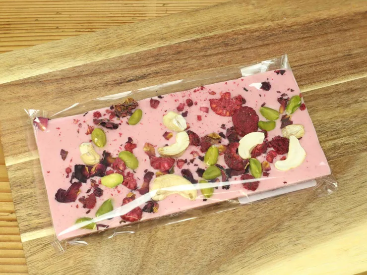 Die Himbeerschokolade ist bestreut mit: Cashew, Himbeeren, Rosenblüten und Pistazien.