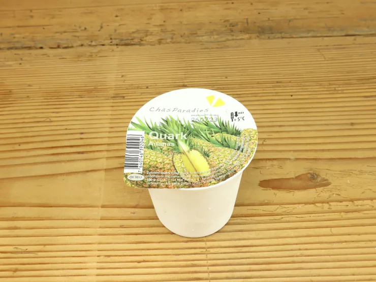 Quark 3/4-fett aus pasteurisierter Milch, Zucker, Ananassaft 5%, modifizierte Wachsmaisstärke, Zitronensaftkonzentrat, Aroma